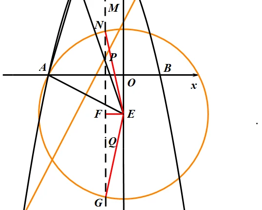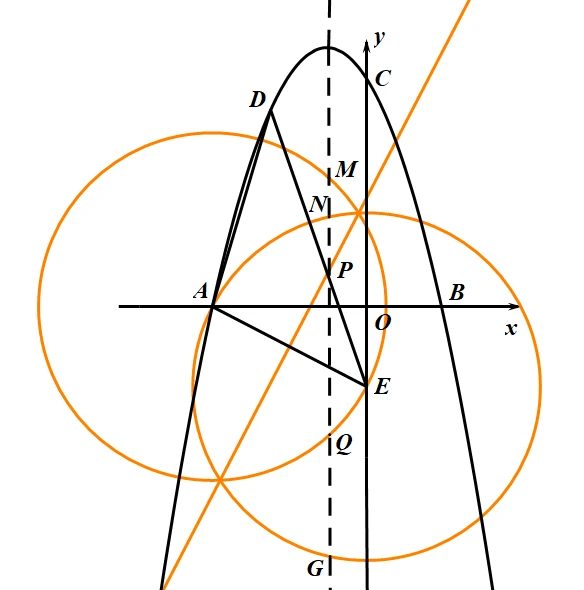 第二种情况,以点$E$为圆心,$EA$为半径,看与对称轴的交点。第一个是$N$,即$P_3$,然后再过点$E$往对称轴作垂线,交点为$F$,则此时用勾股算$NF$,然后你会发现$NF=GF$,且已知$E$点,我们就可以求出$P_3$和$P_4$(即$N$点了)